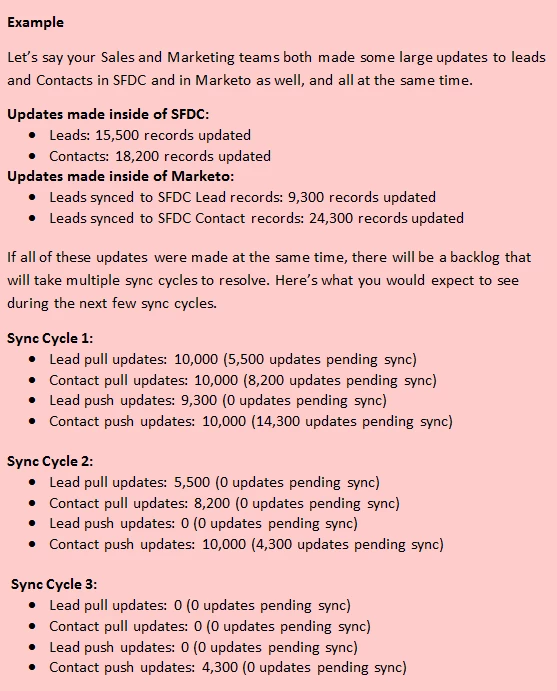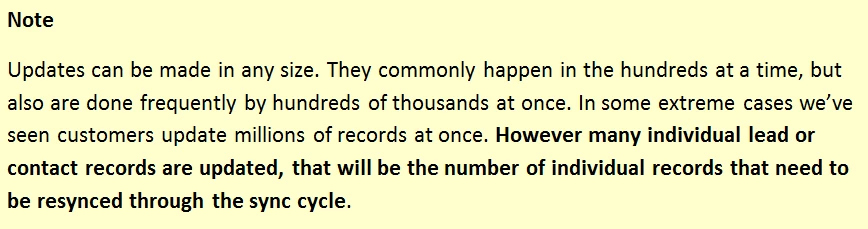 Thousands of updates are synced over in just one API call as opposed to making a single API call for each individual update. Updates synced between Marketo and your CRM through the sync cycle occur in batches—large groups of updates made all at once to allow the data to be transferred more efficiently. That means 10,000 updates to the Lead Object, 10,000 updates to the Contact Object, then 10,000 updates to the Account Object, all within one sync cycle.