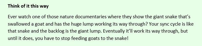 The sync cycle won’t let one Object dominate an entire sync cycle with large numbers of updates. Any updates over 10,000 will wait until the next sync cycle.