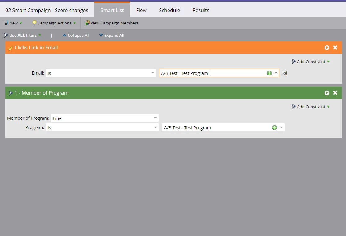 You made an A/B Test within an Email Program, and now when you are in a Smart List or Smart Campaign and are attempting to set up a filter (such as Opened Email), you are unable to locate the A/B test email asset in order to select it.