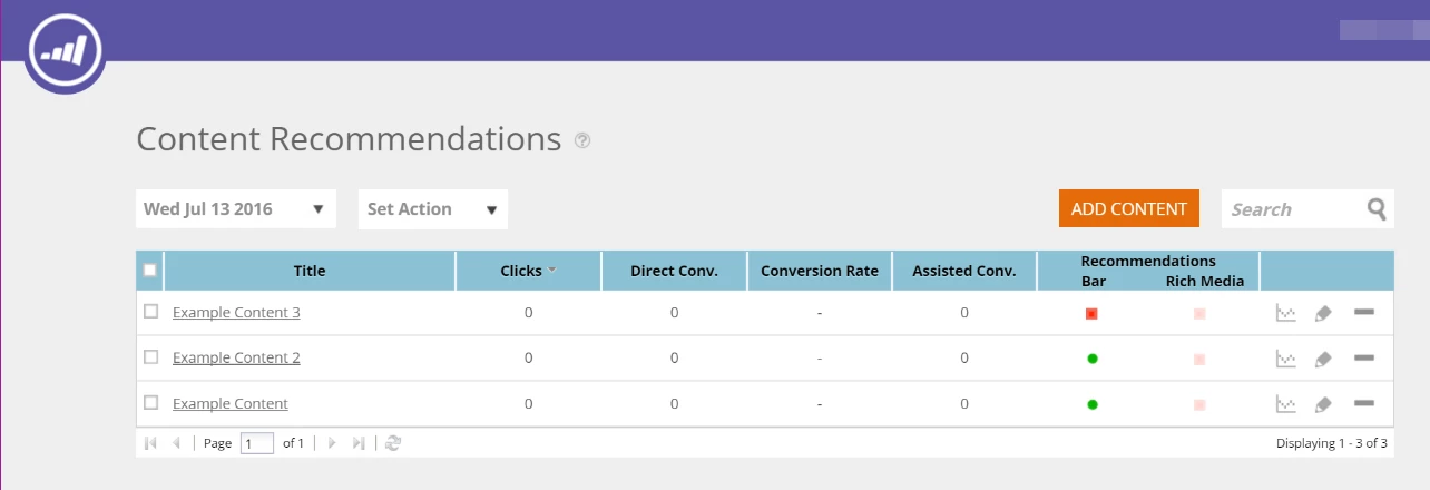 The Content Recommendation Engine uses predictive analytics and machine learning algorithms to deliver relevant content to each prospect. The recommendation engine discovers visitors that share digital behavior patterns, content preferences, CRM data and firmographics (location, industries, size and revenue). It then predicts which content would perform best per visitor and channel (website, social, ad networks). The content for the engine is monitored and controlled under the Content/Assets table, helping you optimize your content ROI.