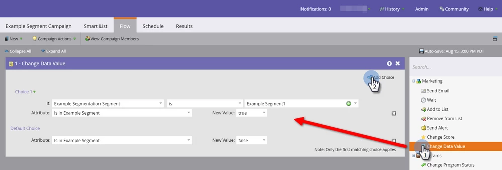 In the Flow tab, select the Change Data Value action, click Add Choice, and format the action to change your custom field to true when the lead qualifies for your desired segment, and false otherwise