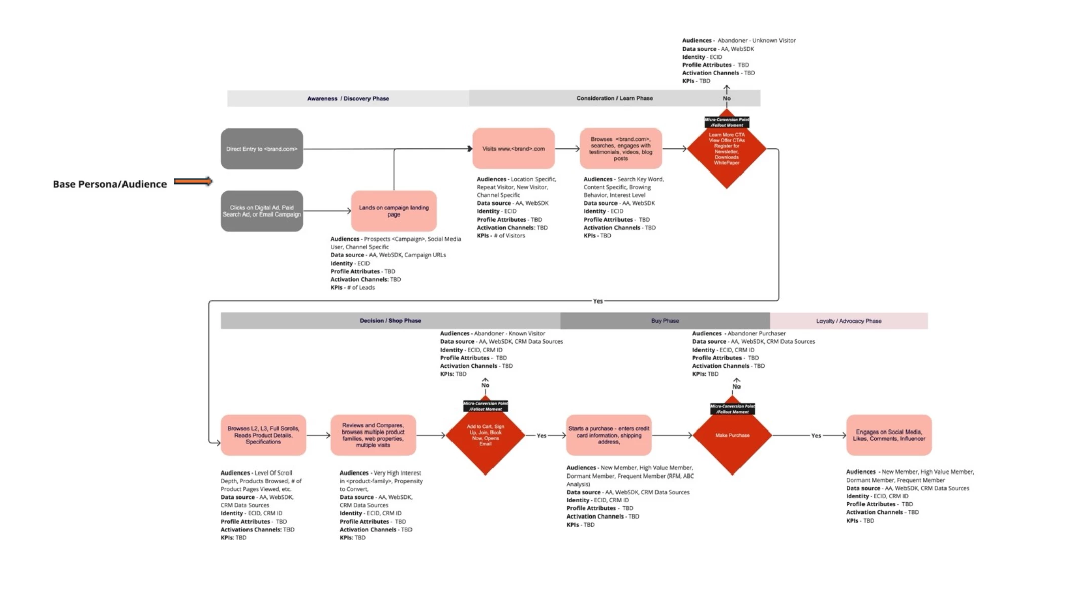 Within the Adobe Experience Platform (AEP), there is a need for a more structured approach to identify, build, and engage high-value and actionable audiences. The current segmentation and activation approach is too narrow and often concentrates on a use case specific single customer touchpoint for achieving final conversion, overlooking the importance of addressing all potential fallout or mini-conversion touchpoints throughout the end-to-end omnichannel journey and conversion funnel for achieving the desired business objective.