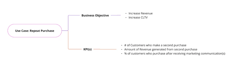 Step 1: Identify Business Objective and KPIs for Use Case: The repeat purchase use case focuses on identifying customers who have made a single purchase within a defined period and aims to re-engage them through targeted campaigns. By encouraging a second purchase, businesses can strengthen customer loyalty, increase overall retention, and enhance lifetime value.