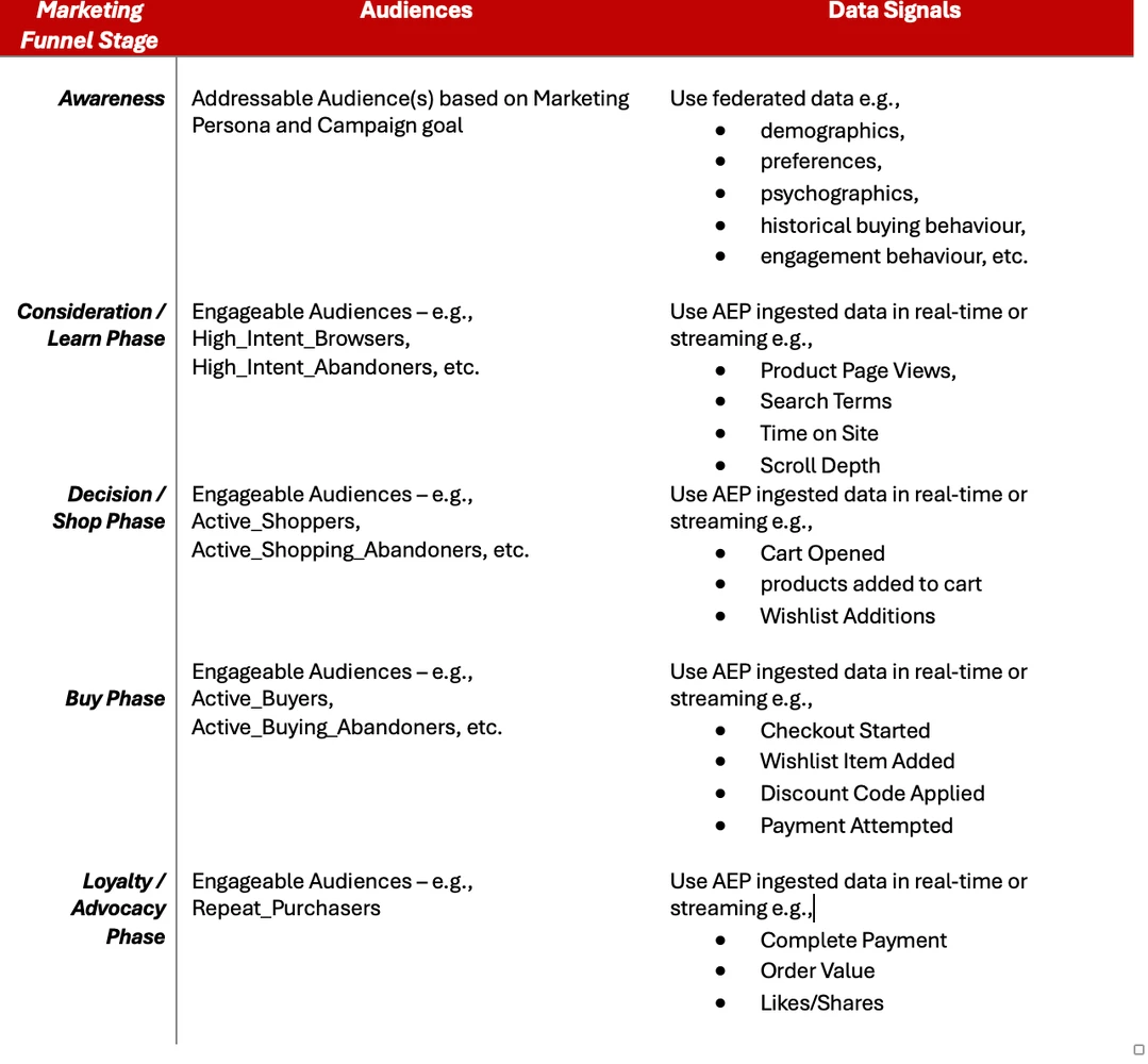 Step 6: Build Engagable Audiences using AEP Ingested Data - Addressable audiences can be enriched with real-time data signals collected in AEP to create dynamic, engageable audiences. By identifying where users engage or drop off, marketers can optimize their approach to meet customer needs at each stage. This allows for precise targeting through personalized, omnichannel campaigns, addressing users at critical moments from awareness to conversion. The result is improved engagement, higher conversion rates, increased customer loyalty, and better overall marketing performance.