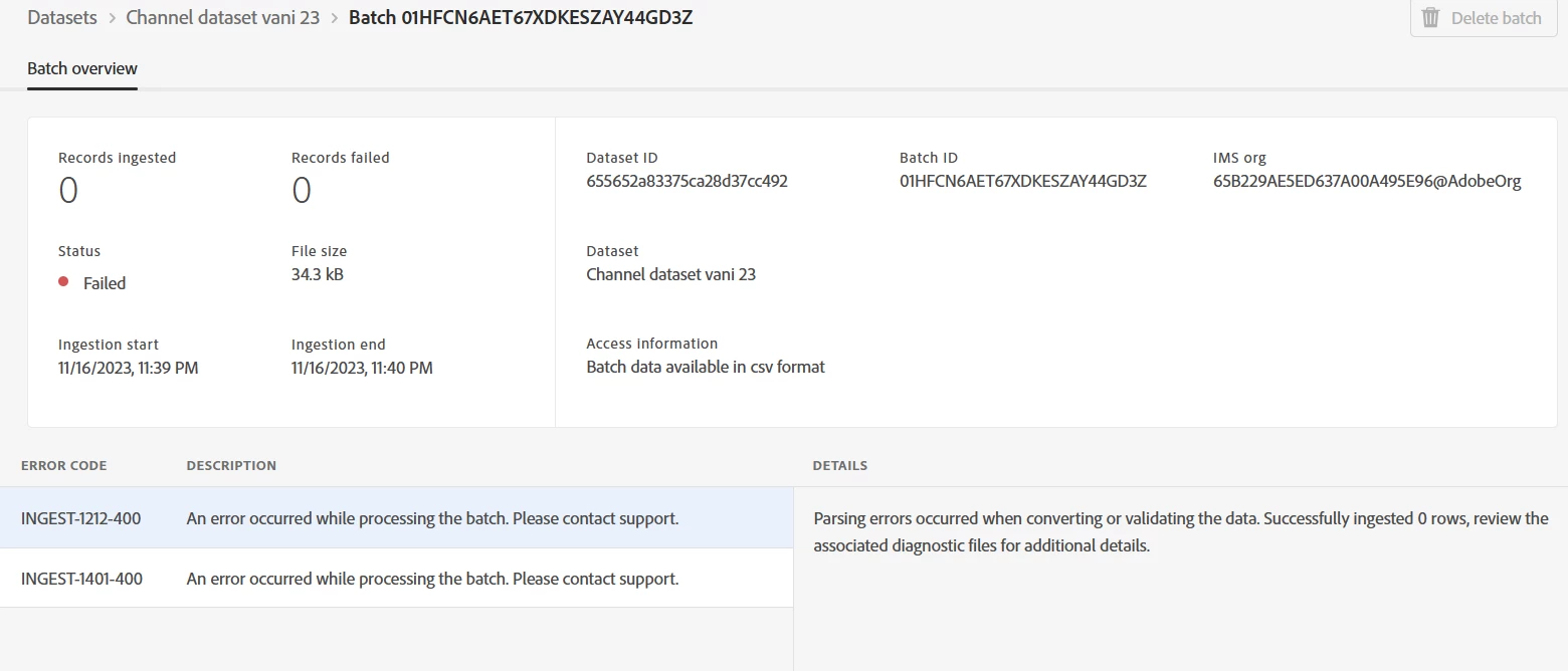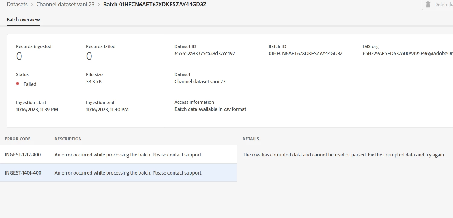 Getting error while ingest 1000 records from local system in to AEP dataset. | Community