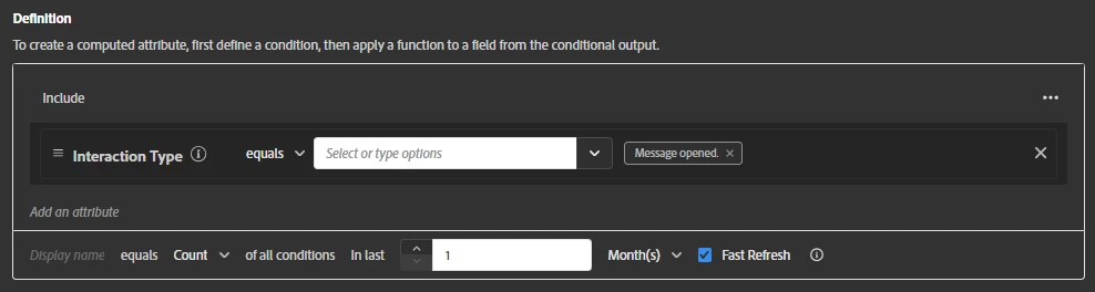 I am a RTCDP and AJO user who is trying to create a computed attribute that counts the amount of emails a user has opened in the previous month. I am struggling to create it and I am writing to see whether anybody can help me solving the issue. The purpose is to a have this field at profile level, even knowing that we can count the amount of emails opened when creating audiences.
