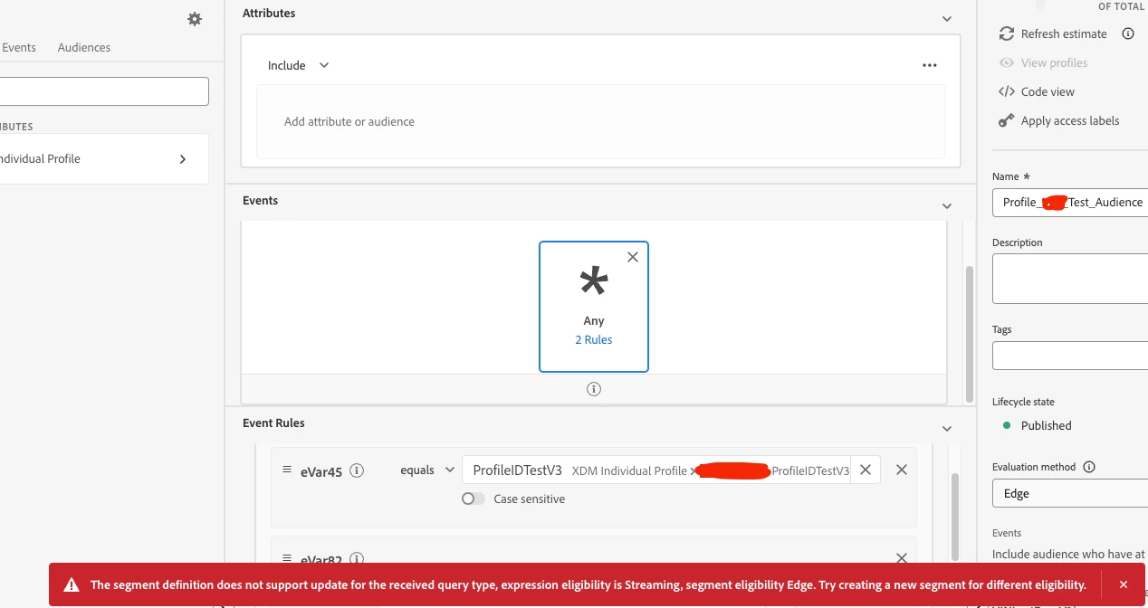 We've created a dynamic segment that compares an event data with a profile attribute. however, when i select EDGE as the evaluation method, I encounter the following error shown in the screenshot, Could anyone provide guidance on how to create this an edge segment?