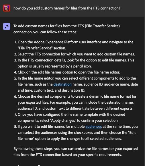 So, our team has been generating files within AEP to send out of AEP via FTS connections. We do not have the ability to custom name these files. Is there a work around to name these files?