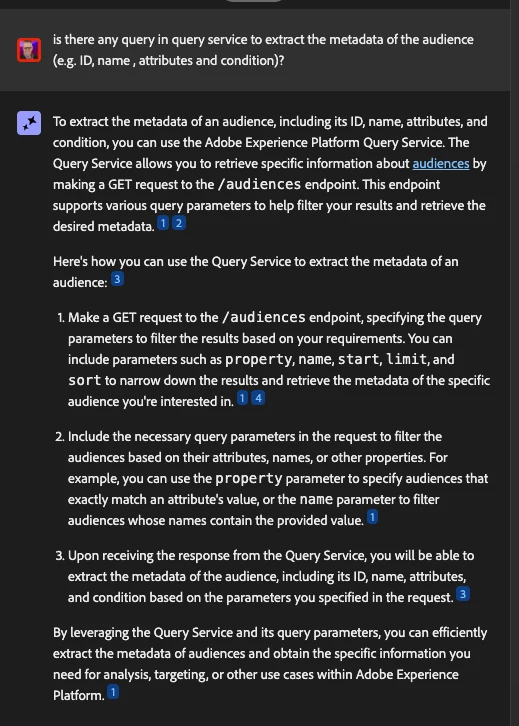 By leveraging the Query Service and its query parameters, you can efficiently extract the metadata of audiences and obtain the specific information you need for analysis, targeting, or other use cases within Adobe Experience Platform.1