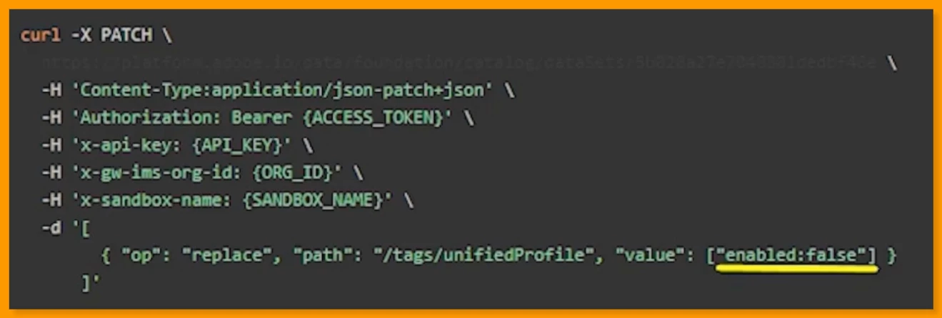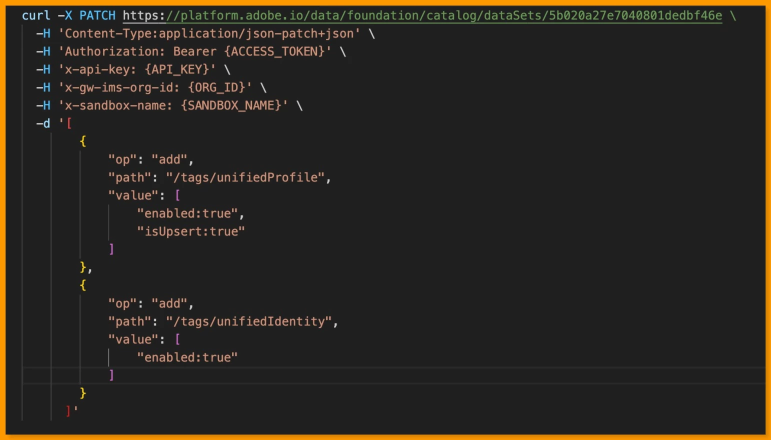 The request body includes a path to unifiedProfile setting the value to include the enabled and isUpsert tags, both set to true, and a path to unifiedIdentity setting the value to include the enabled tag set to true.