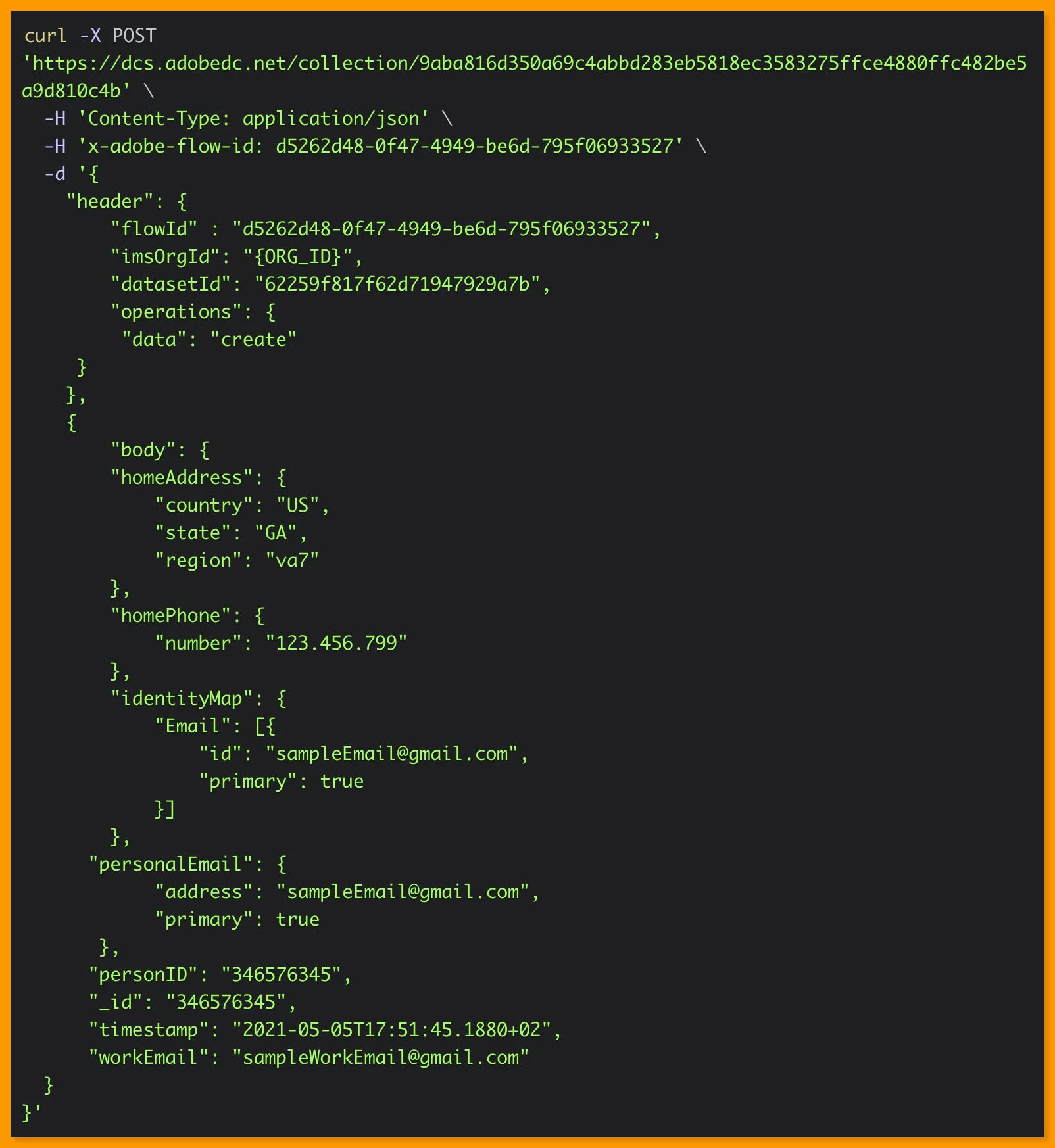 In the example below, the attributes such as state and homePhone.number are upserted with their respective values into the Profile associated with the primary identity sampleEmail@gmail.com.