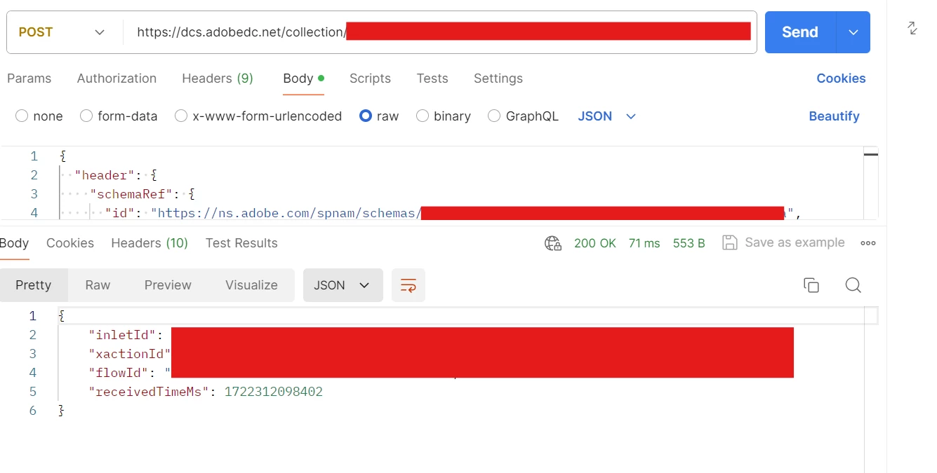 Open up postman, and create a new POST request. Feed the streaming endpoint from above into the request url. The other two values, dataflow id and the dataset id will come in handy when creating the POST Body request.