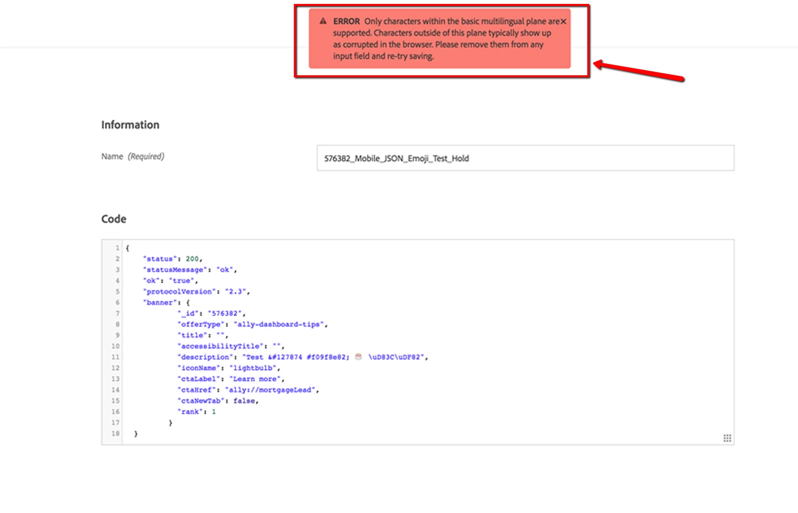 Issue: Currently when we try to do this we get an error that states: "ERROR Only characters within the basic multilingual plane are supported. Characters outside of this plane typically show up as corrupted in the browser. Please remove them from any input field and re-try Saving" See screen-shot below.