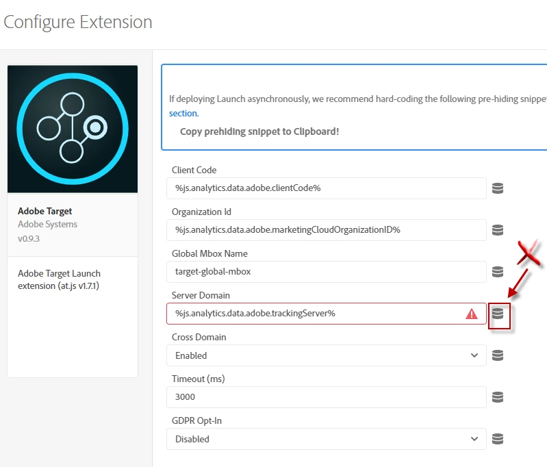If it is not allowed to have dynamic reference to the Server Domain field within the Adobe Target extension, can Adobe remove the Data Element icon? Confusing!