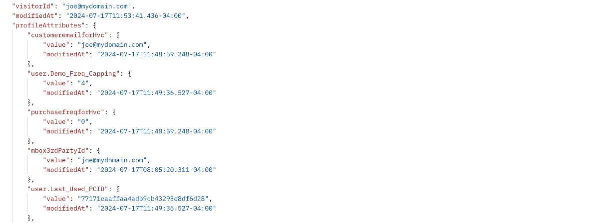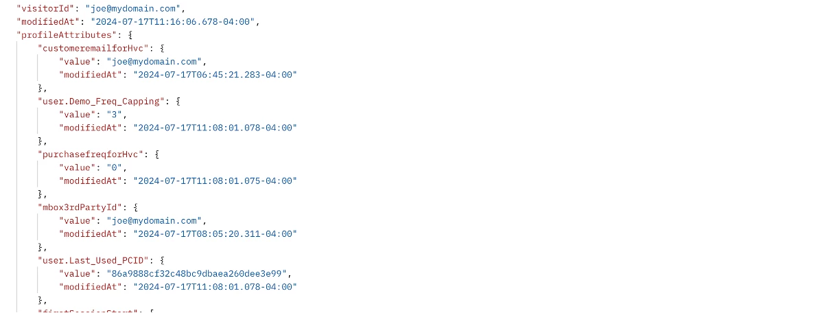 1. You'll see that the visitor id is "joe@mydomain.com" - this is the mbox3rdPartyId value passed by the website.