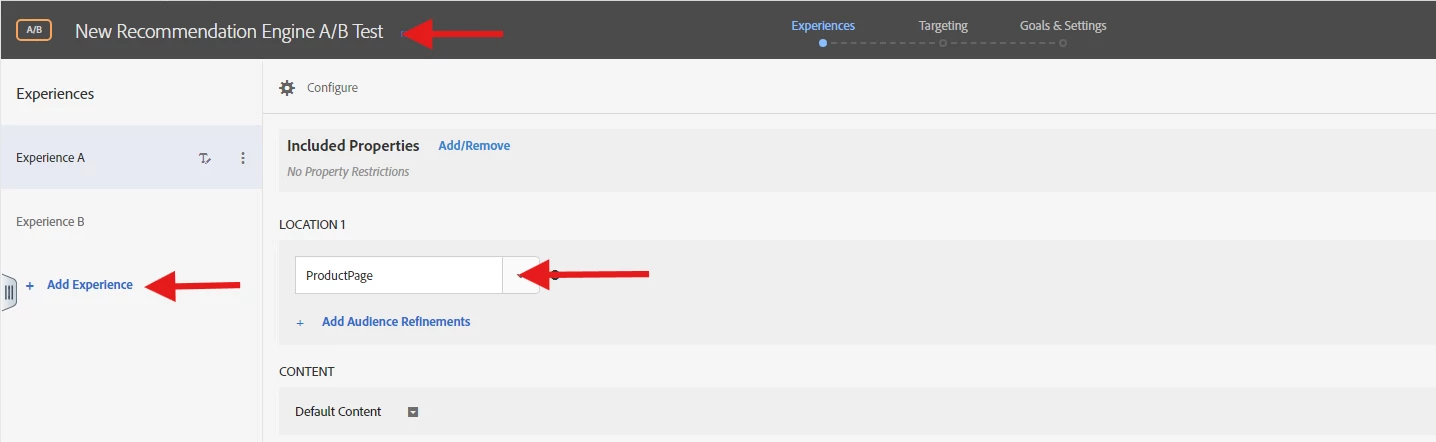 In the Experiences step of activity creation, (1) provide a name for your activity (2) and add a second experience, Experience B, by clicking the Add Experience button. (3) Enter the name of the location within application where you want to execute your A/B test. In the example shown below, ProductPage is the location defined for Experience A. (It is also the location defined for Experience B.)