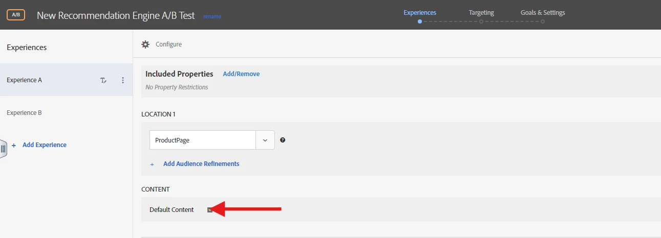 Experience B defines the challenger, which will represent a new recommendation engine on product page. Click to change default content