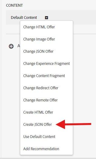 In Experience B, click to change the content from Default Content to the redesigned content by selecting Create JSON Offer as shown below