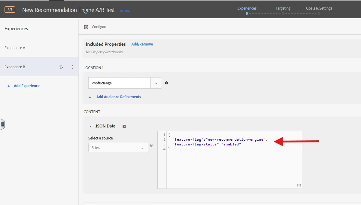 - In Adobe Target, define the feature flag as a parameter that can be toggled on or off. This flag will control whether a feature is active for users.