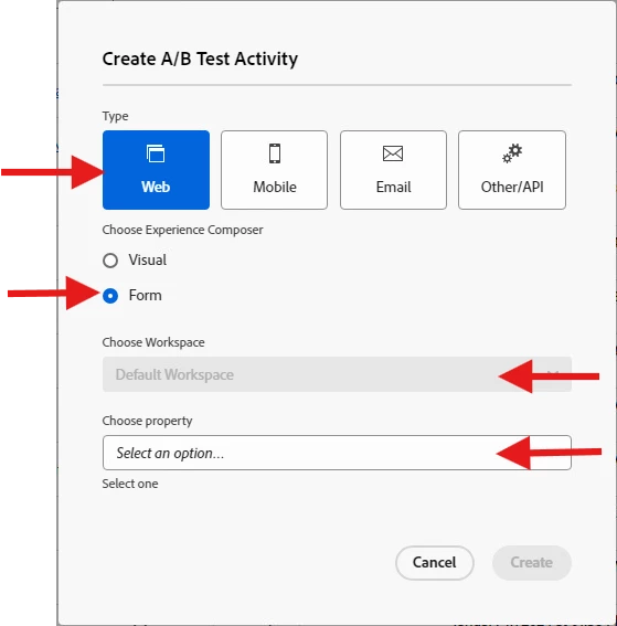 - In the Create A/B Test Activity modal, leave the (1) default Web option selected, (2) select Form as your experience composer, (3) select Right Workspace with Right Property - if any else chose No Property Restriction and (4) click Next.