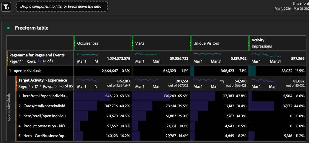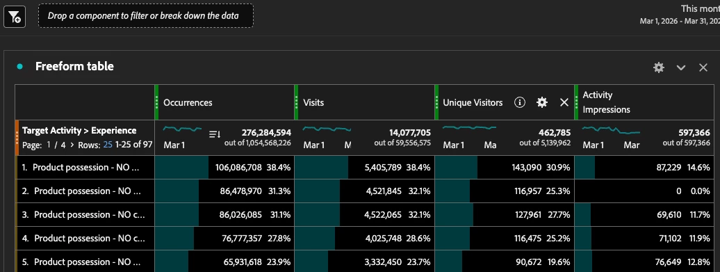If I use a Prop that is also sent on the Adobe Target requests, I’m able to list activity linked to it when using “Activity impressions” (the activities that is are 0), but the other metrics give activities that are from other pages.
