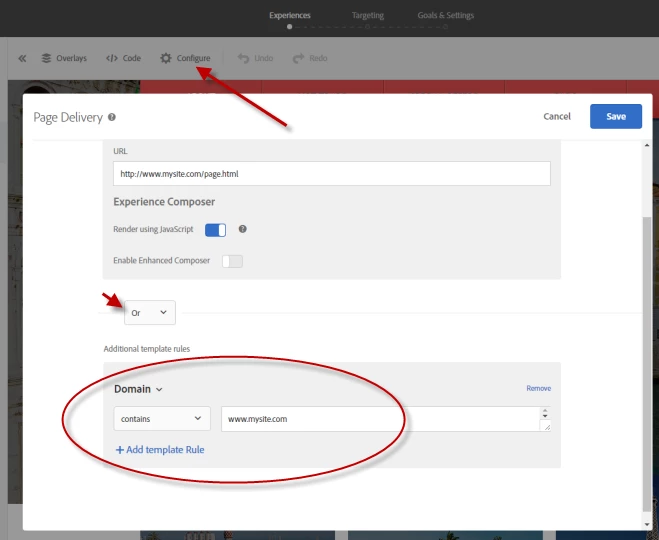 Configure (gear icon) > page delivery > add template rule with "OR" condition.