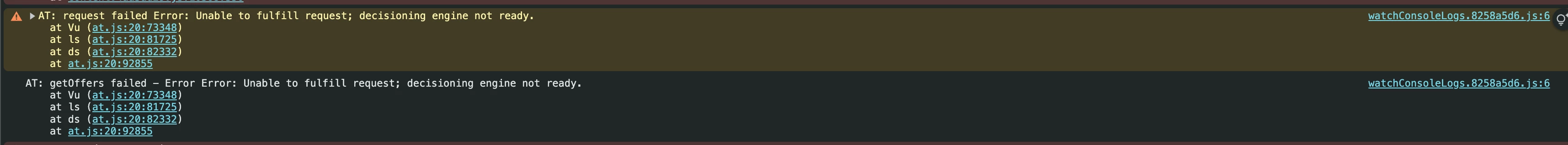 AT: getOffers failed - Error Error: Unable to fulfill request; decisioning engine not ready.