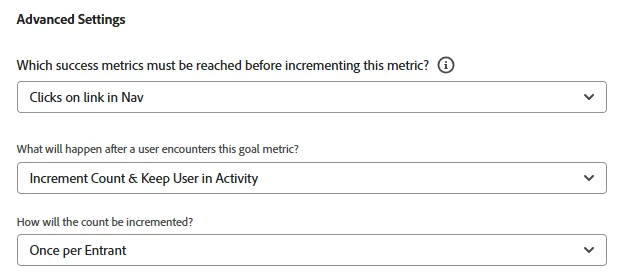 How come I can only add dependecies on certain metrics in the Goals & Settings? I have three metrics. One of them is a conversion metric tracking pageviews. I don’t want it to track unless another success metric has been reached and when I select advanced settings, I have the option to click which one.