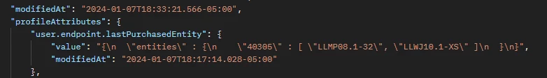 Despite closely following the Adobe documentation (Adobe Experience League), I am not seeing the desired result. The 'lastPurchasedEntity' is not being reflected in the user profile as it did when I was using at.js, where parameters such as orderId, orderTotal, and productPurchasedId were passed effortlessly.