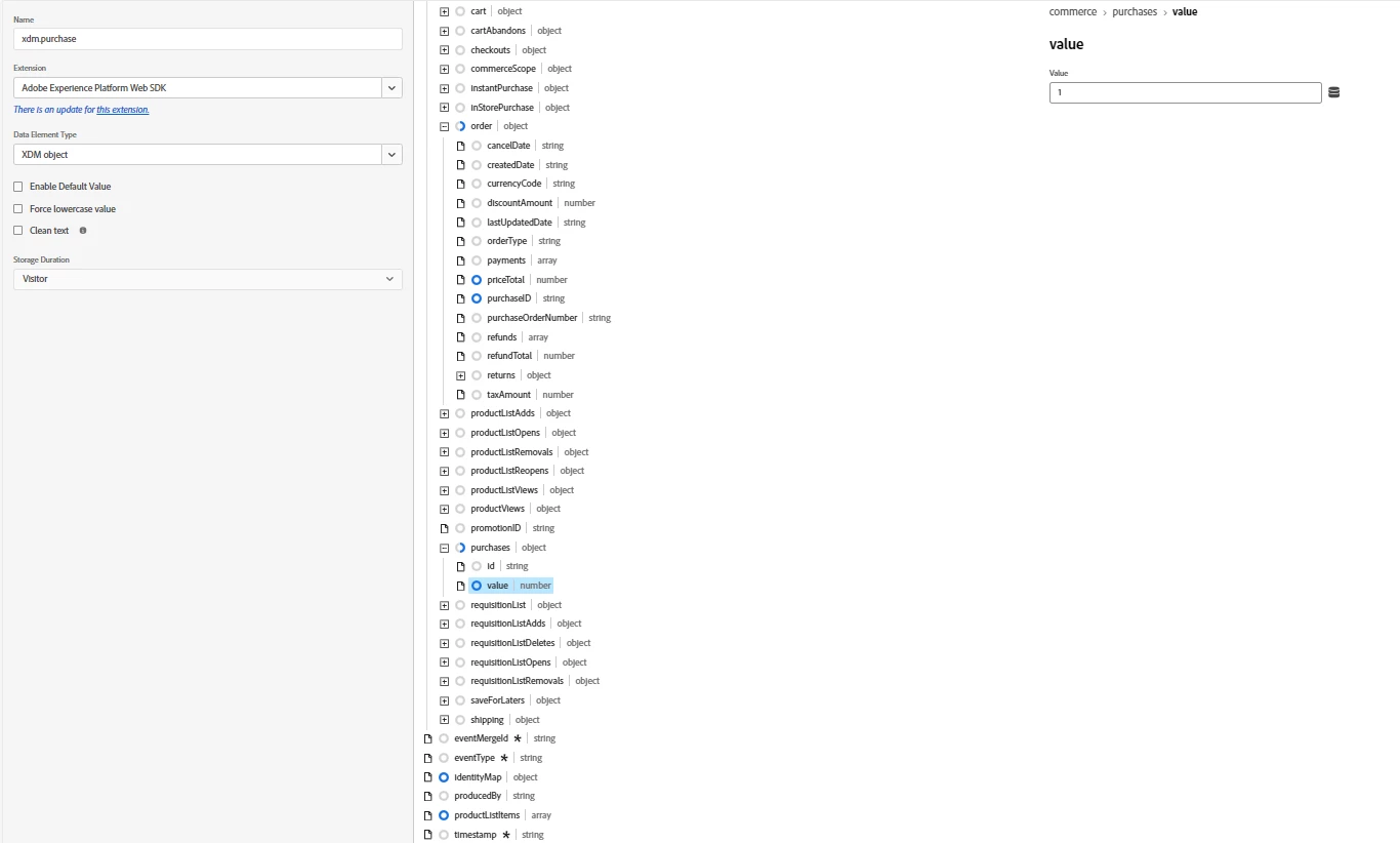 - 'priceTotal' and 'purchaseID' within the commerce field.