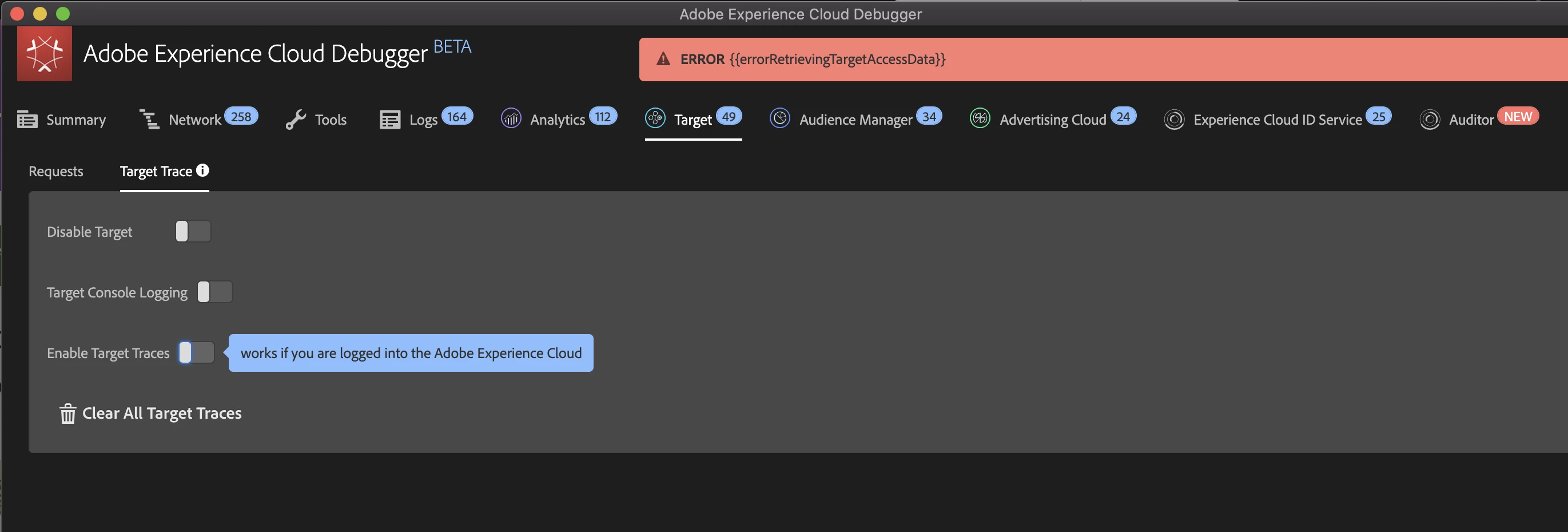Not sure if related, but the Adobe Experience Cloud Debugger throws me the following error when I try to turn on Target Traces.
