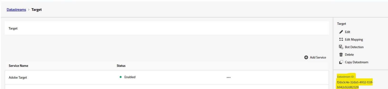 - Before making API calls using the EDGE API, ensure the DataStream is configured in the Adobe experience Platform UI and the Adobe Target Service is also added in the same. Below is the snapshot of DataStream: (This is required only for EDGE API)