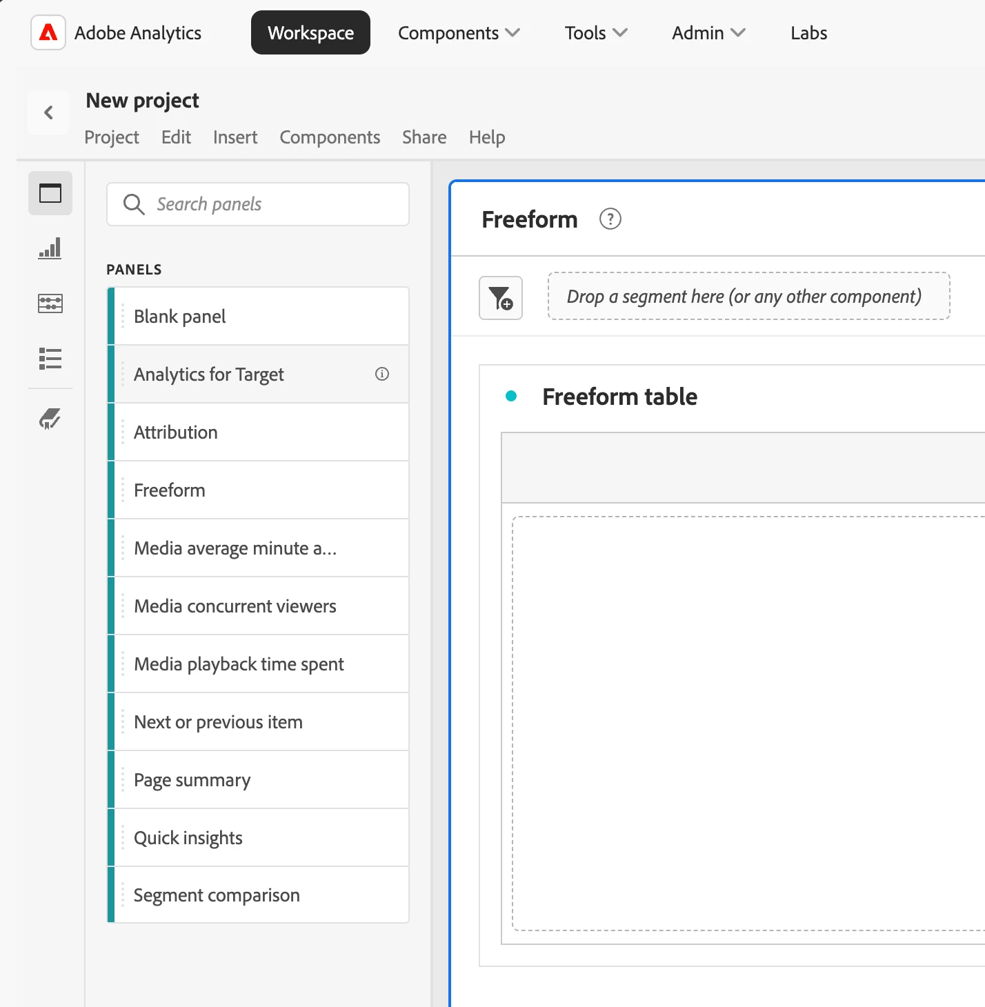 - Navigate to Adobe Analytics Analysis Workspace and add a Freeform table to the panel.