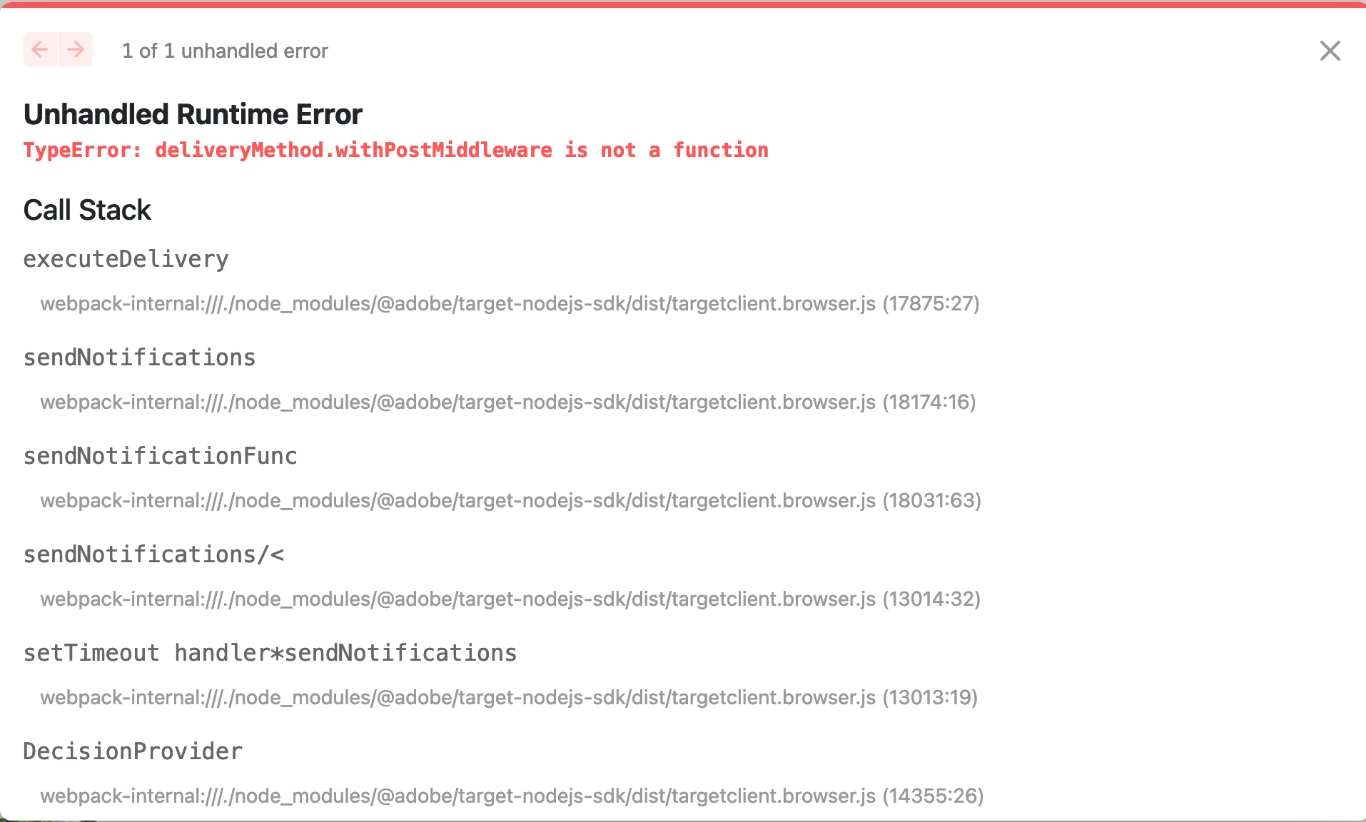 The error likely occurs because browser-specific code is being executed in the server environment, or vice versa. The most common cause is incorrect SDK import or an inadequate Webpack configuration that mixes client-side and server-side code. Checking your imports and build configuration should help ensure that each environment is using the appropriate code.