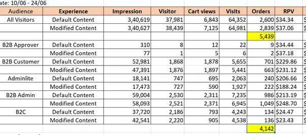 Now the issue is, when you check the Target report metrics (for example, orders, visitor counts etc.), it shows inconsistent data between the "All qualified visitors (default)" and the total sum of audience segments (B2B-approver, B2B Customer, adminlite, B2BAdmin, B2C) that were added to the Target activity.