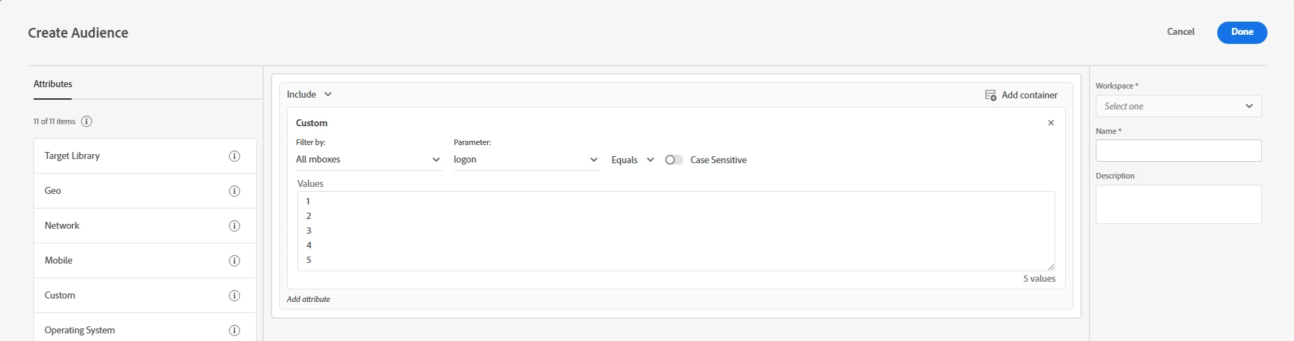 Hi! I'm creating audiences in Adobe Target and adding multiple values in the custom parameter filter. I’d like to know if there’s a defined maximum limit or a recommended number of values for this configuration. At what point could performance be impacted, or is there a limit that’s generally not advisable to exceed?