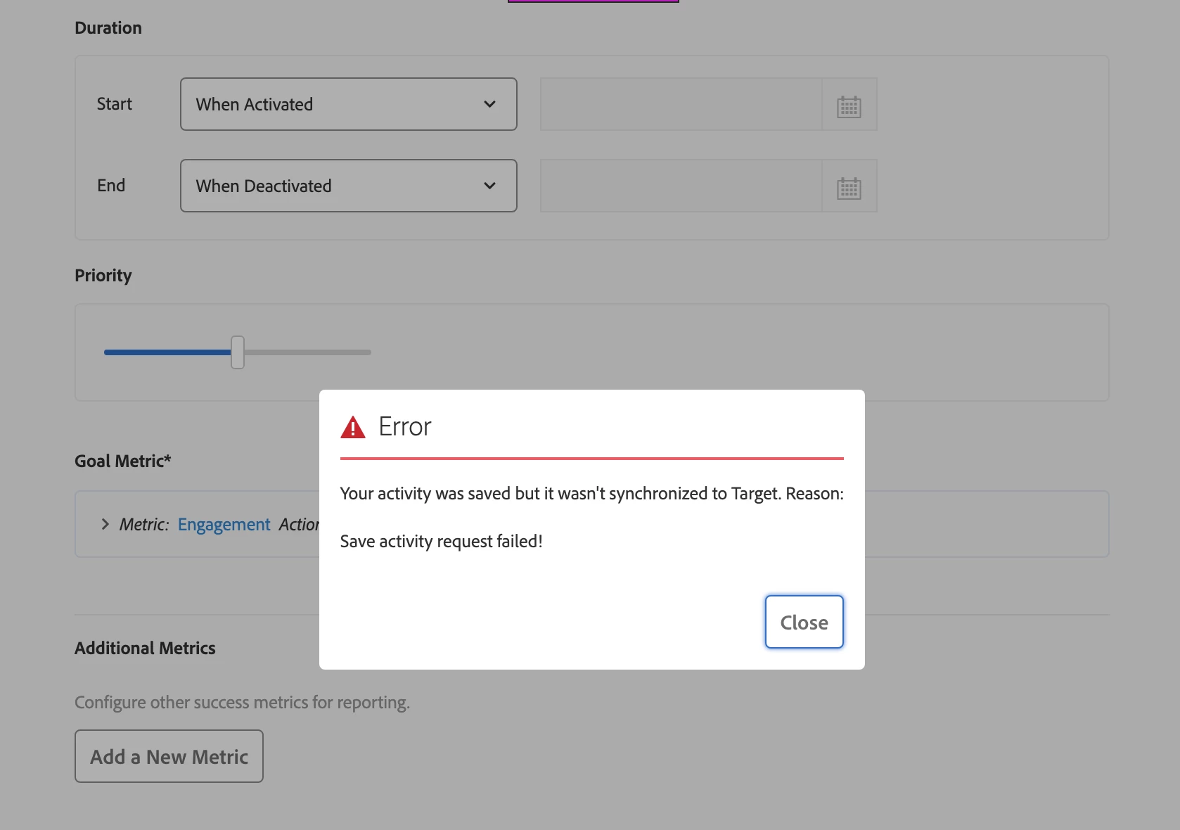 We have encountered an issue while saving an activity in AEM for targeted content. We currently have an integration with Adobe Target, and the integration has access to the required workspace. Has anyone else experienced this issue?