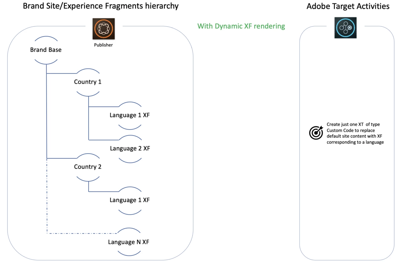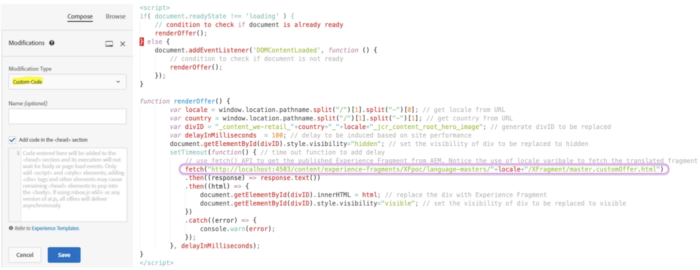 Ability to create a Target Experience Activity with Modification type ‘Custom Code’ that dynamically renders a language specific Experience Fragment from AEM (publisher) over Ajax.