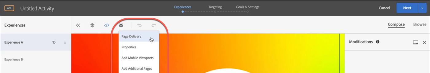 - In the Visual Experience Composer (VEC) click the gear icon, then select Page Delivery