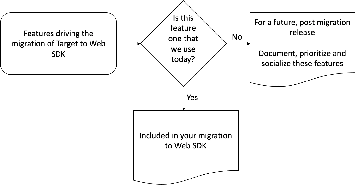 There are two questions that can help you scope out what goes into your use cases versus what gets put into a future release, post migration. When deciding feature requirements for your Platform Web SDK migration, ask yourself: "Is this feature one that we use today?"