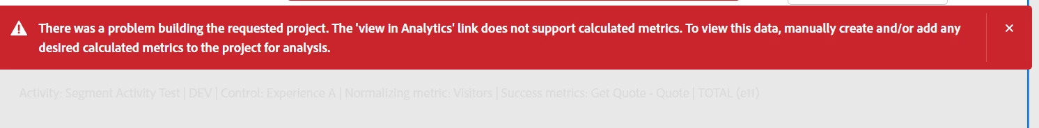 I am trying to get Analytics segment data in Target A/B activity , Unfortunately getting error when click on View in Analytics link. Created segment in analytics and used that as audience in target activity and trying to see real time data. Could some one please help here how to resolve this error. error attached