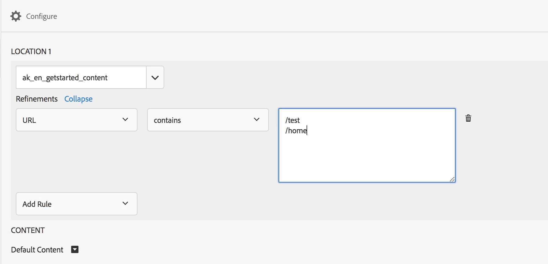 Example: We would like an activity to show on our homepage and landing pages. While the landing pages have values in the url that we can target, the homepage does not. To target the homepage, we have to use the "Path | is | /". Because "path" is different from "url contains," it adds a new line and is considered an "and" statement.