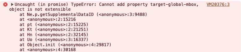 I've observed that a "target global mbox extensible error" is being triggered, but only on certain pages, and notably, when those pages are fully loaded. As a result of this error, we are not seeing any Target delivery on those pages, and the associated Analytics metrics are not being triggered either. Upon investigation, it appears that this error is originating from Adobe Visitor API library. This could be contributing to the failure in both the Target delivery and the Analytics calls. Is there any one facing this issue and identify the root cause and suggest a solution?