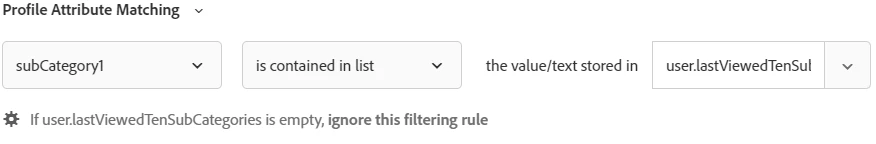 "user.lastViewedTenSubCategories" is a profile attribute which contains sub categories separated by comma.