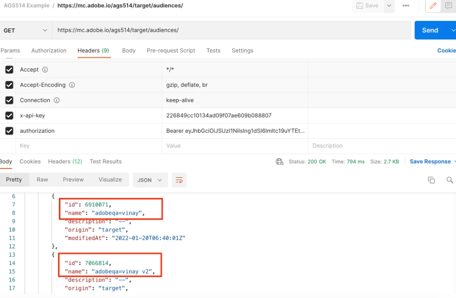 Once you have Postman ( https://www.postman.com/ ) you can use a sample request for the Admin API here ( https://www.getpostman.com/collections/faa0cb00c6323ee024a6 ). This request will allow us to see all the audiences in my sandbox.