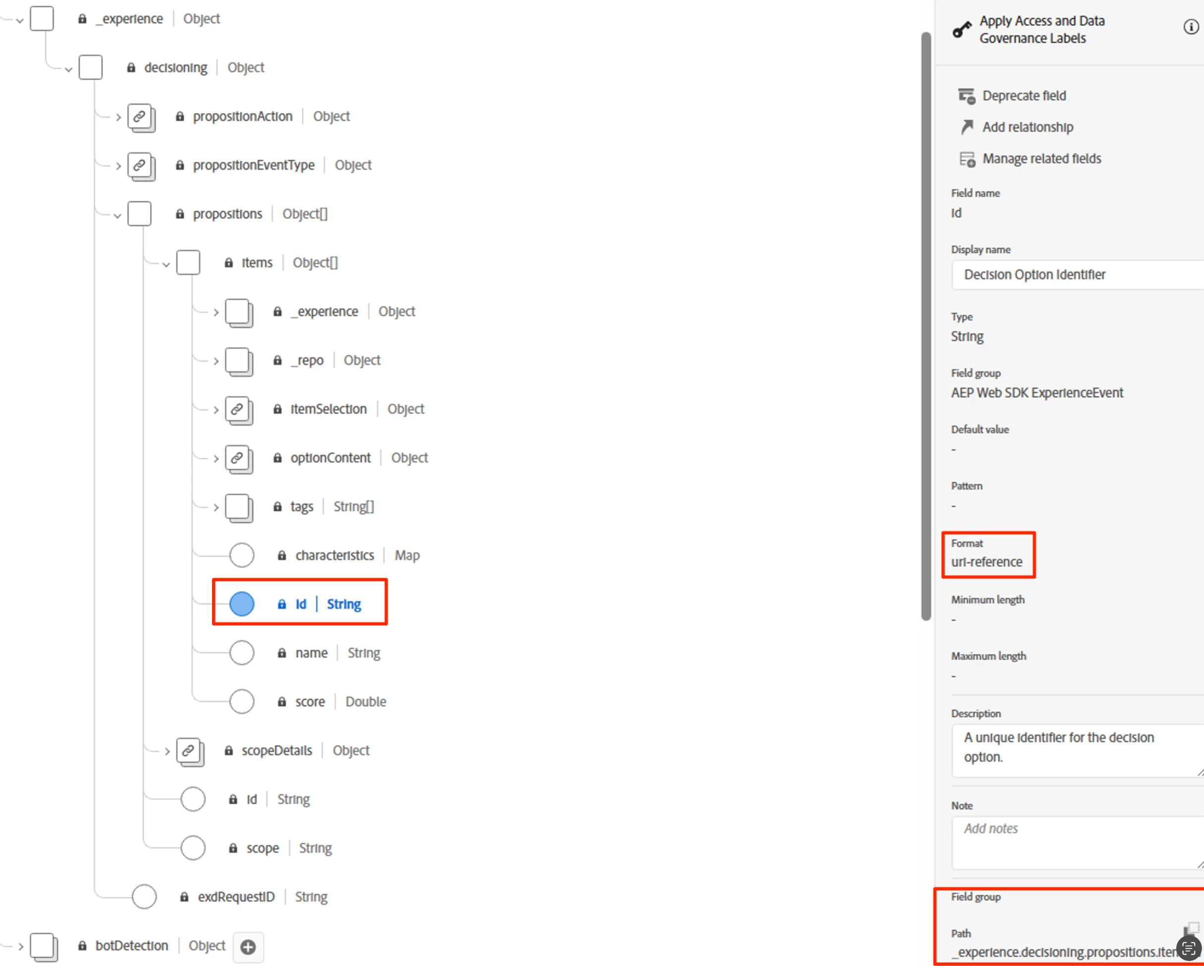 Now, looking at the schema, the field indeed requires a url-reference formatted string in events[0].xdm._experience.decisioning.propositions[0].items[0].id