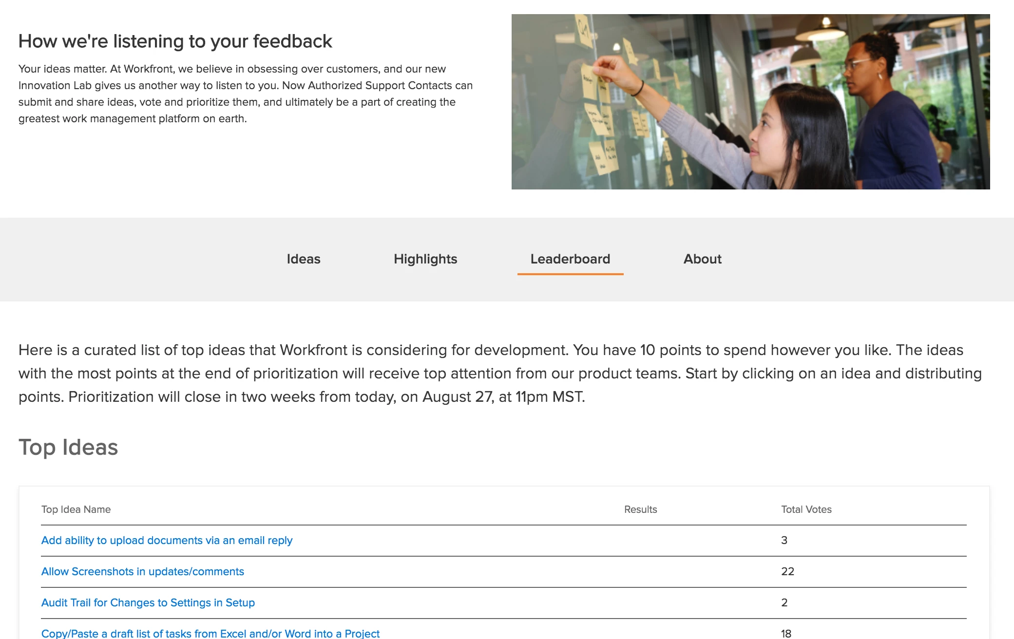 One of the most exciting elements to Innovation Lab is the twice-a-year feature prioritization voting. Workfront’s product managers will present a curated list of suggested features for further ranking. During each two-week period, Authorized Support Contacts (ASCs) get 10 extra points to use specifically on this list.