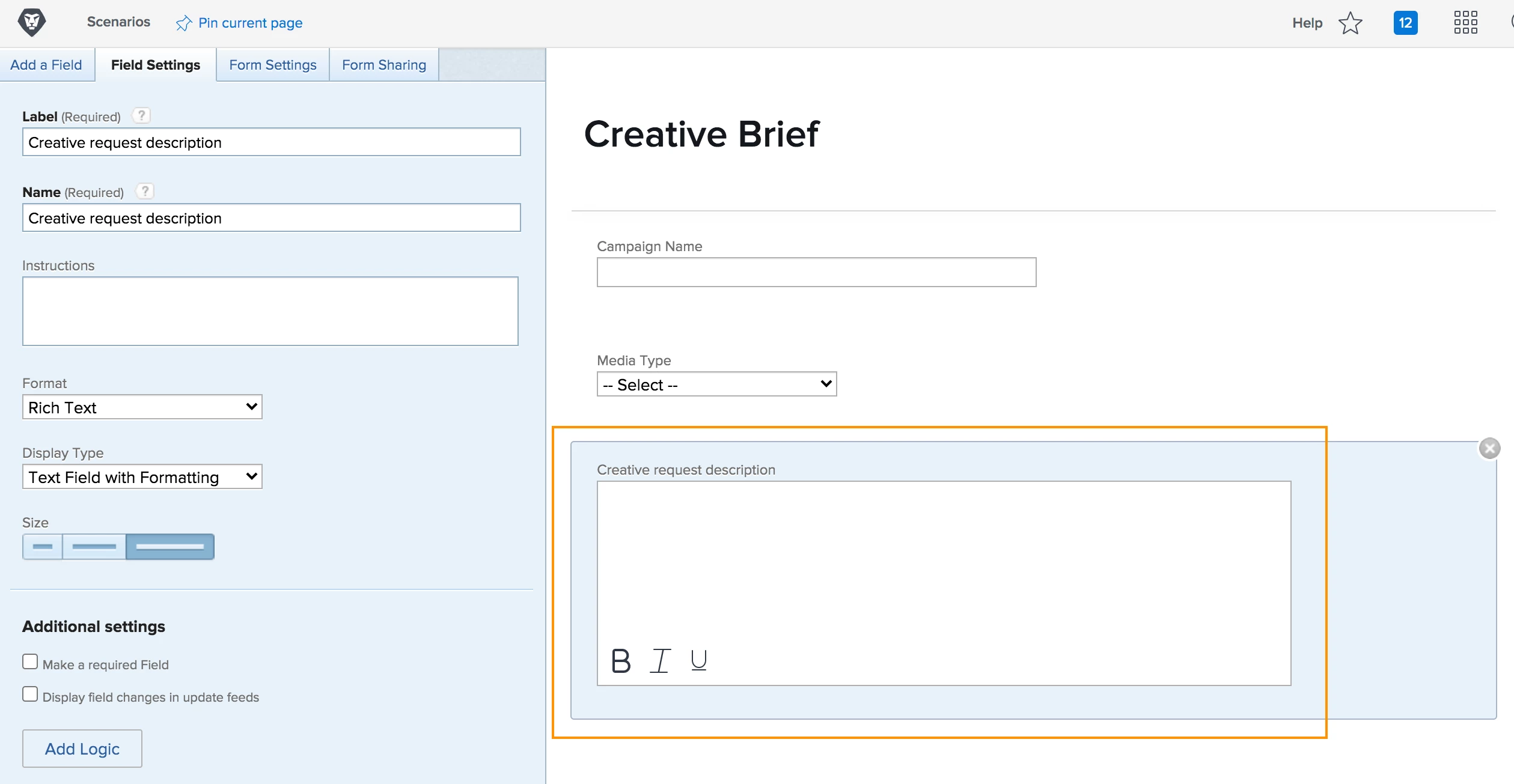 A new custom form field—Text Field with Formatting—allows a user to bold, italicize, or underline text within the field as they’re filling out the custom form.