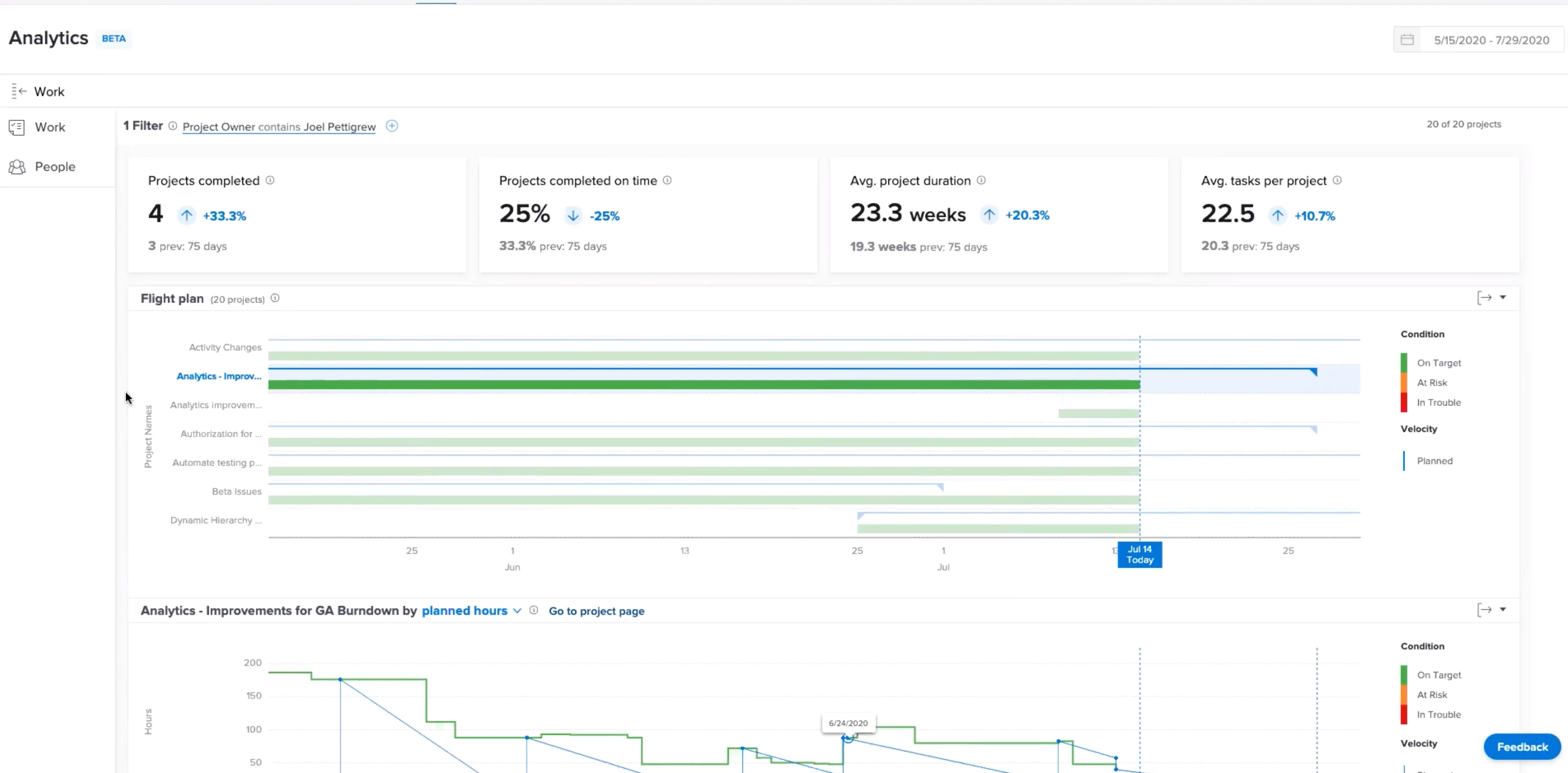 Only available to customers with a Business or Enterprise plan, enhanced analytics, allows you to look at project and team data to identify trends and get insights into performance. It is available to users in both Workfront Classic and the new Workfront experience and consolidates tons of information into easy-to-read charts, gives a snapshot of your projects in a given timeframe and even lets you drill down to see how much time was spent on work by each team member.