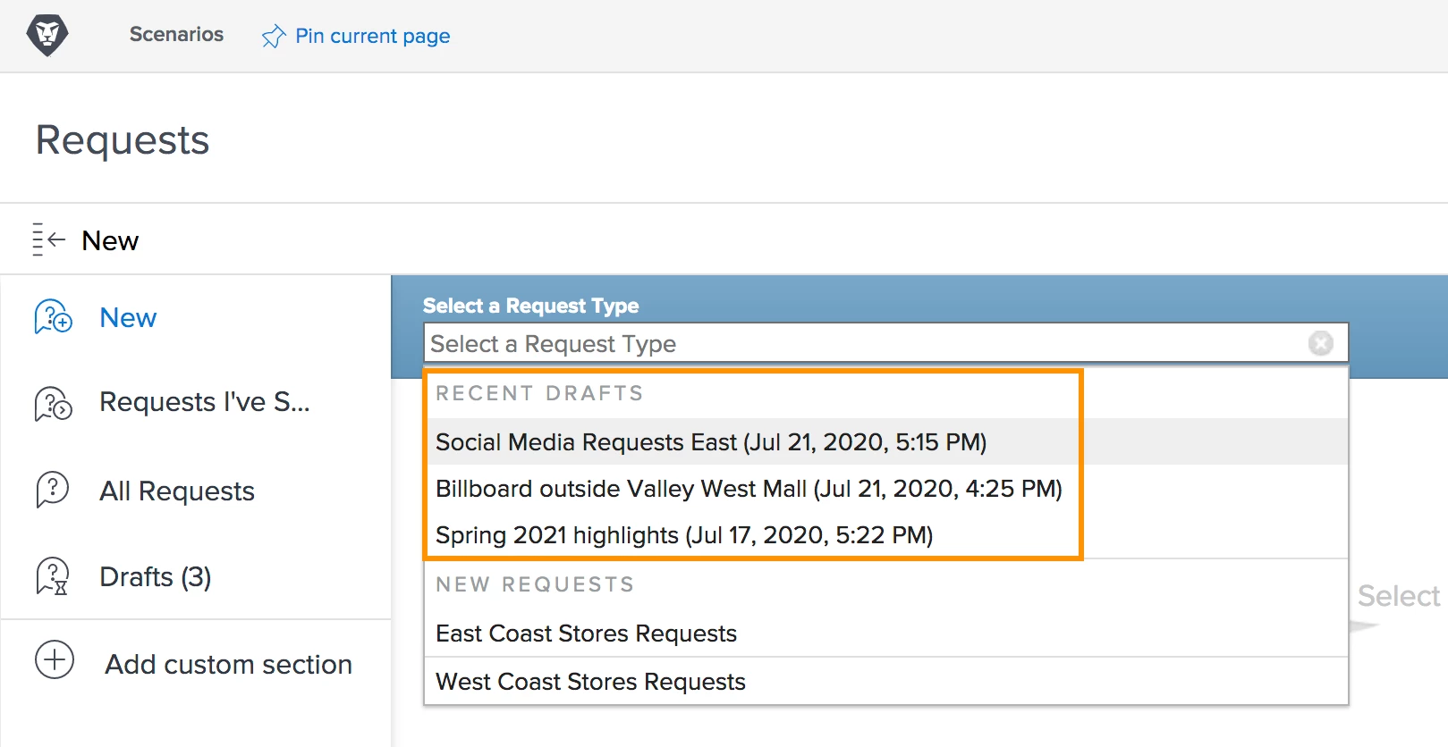 When you’re ready to submit the request, find it in the Drafts section or in the drop-down list as you make a new request.